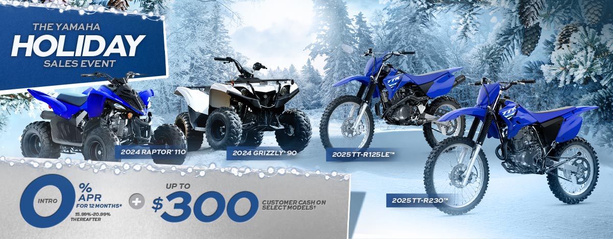 *Offer available on approved purchases of new 2023-2026 Yamaha PW50, TT-R50E, TT-R110E, TT-R125LE, TT-R230, YFZ50, Raptor 110, Raptor 90, Grizzly 110, Grizzly 90 models made on the Yamaha Credit Card issued by WebBank. Offer valid 10/1/2025 -12/31/2025. Account must be open and current to be eligible for this offer. Introductory 0% APR for tier 1- 3 financing with minimum payments of 1% of the purchase price balance are effective for initial 12 months based on creditworthiness. After the 12-month introductory period, standard APR 15.99%, 18.99%, or 20.99% based on creditworthiness, with minimum monthly payments shall be equal to the greater of 1% of the existing balance plus standard interest charges, late fees and late payment amounts, or $25 until the purchase price is paid in full. Minimum interest charge $2 per month. Promotional rates are based on creditworthiness. Not all applicants will qualify.